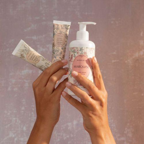 Formulé à 97 % d’ingrédients d’origine naturelle et fabriqué en France, il hydrate, nourrit et protège la peau tout en laissant un voile parfumé élégant. Son décor raffiné, inspiré du 18ᵉ siècle et dessiné à la main, reflète la subtilité et la personnalité de chaque fragrance.